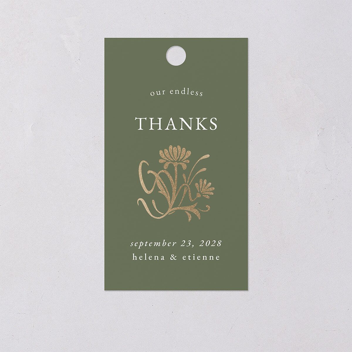 Decorate every present with art nouveau favor gift tags. Your tags include a flourishing foil flower alongside thin, contemporary fonts reading your lovely message, name, and wedding date.