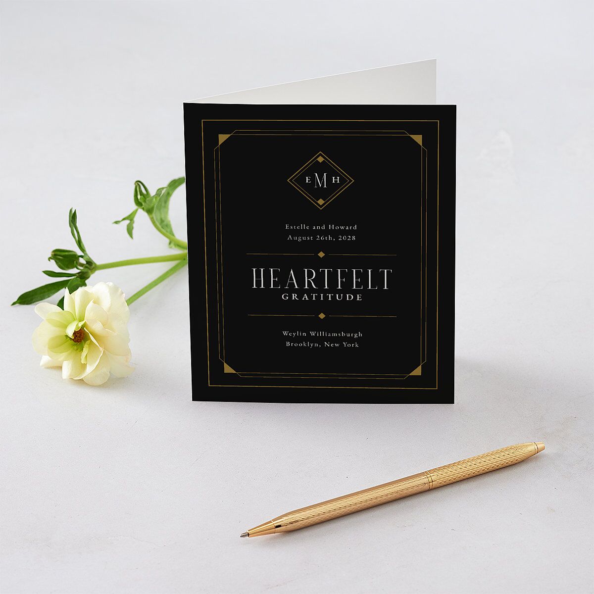 There's definitely a touch of old Hollywood in these thank you cards. An Art Deco-style border surrounds your initials, names, wedding date, and wedding venue, as well as the words "heartfelt gratitude" in a classic serif font.