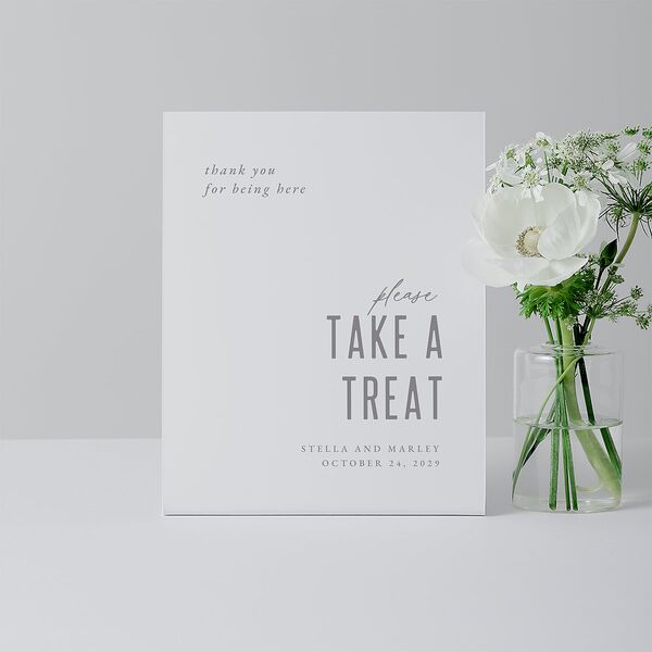 A spacious arrangement of typography sets the tone for an enchanting occasion with these bended signs. The top left and corner displays a heartfelt thank you to guests for their presence, while the bottom right features text in a combination of script and bolded sans serif fonts. Your names and wedding date are presented underneath for a charming touch of personalization.
