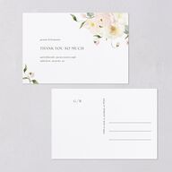 Thoughtfully placed florals seem to grow organically across these thank you postcards. A centered, minimalist font delivers your note of gratitude, slightly offset to the left beneath the lush blossoms above. The reverse offers ample space for a personal handwritten message.