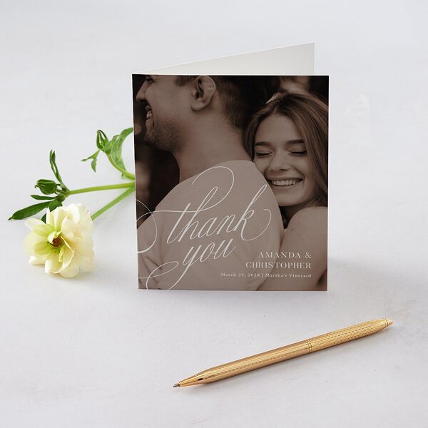 After all the celebrations, show your appreciation to your guests with these wedding thank you cards. Each shows your chosen photo as the backdrop and the phrase "thank you" in flowing script complemented by subtle serif typography.