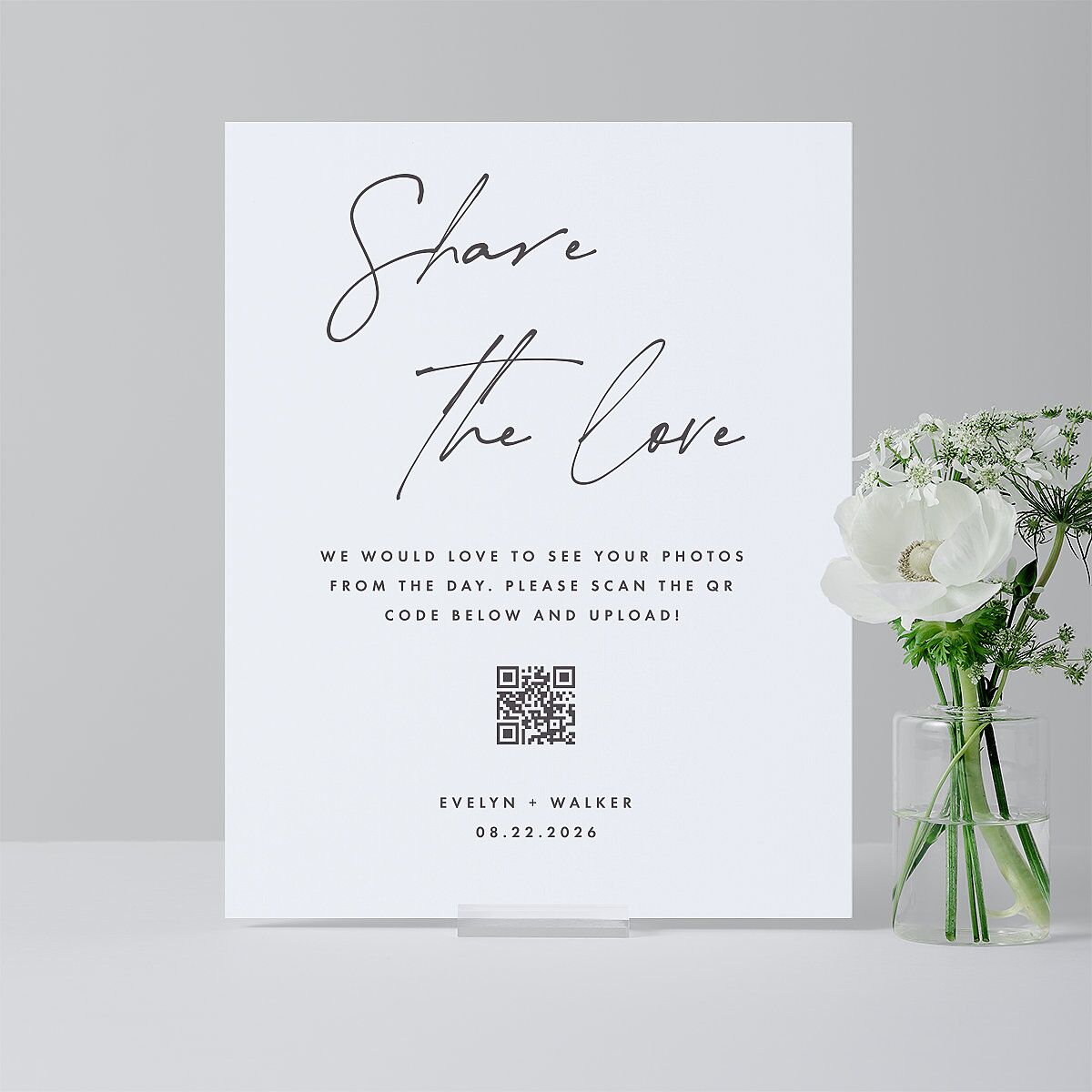 These favor tabletop signs invite your guests to "Share the Love" with a striking mix of script elegance and modern sans serif fonts. Set against a plain background, the layout showcases your names and wedding date with polished simplicity, while a prominent QR code graphic takes center stage.