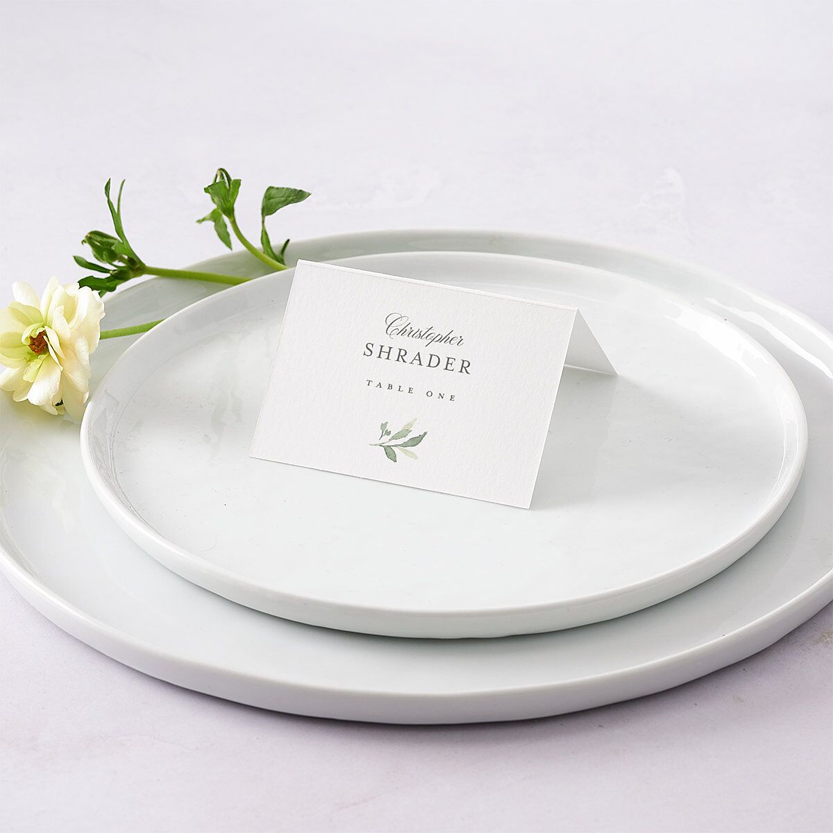 Each guest's first name flows across the place card in a calligraphic style, followed by their surname in uppercase lettering. Hand-painted greenery adds a flicker of nature to an otherwise understated backdrop.