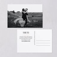 Capture the memories of your wedding production with these romantic movie poster-inspired thank you postcards. They showcase your chosen wedding portrait overlaid with cinematic fonts that express the excitement of your Hollywood “happily ever after.”