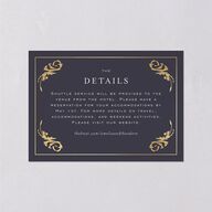 A slim frame runs smoothly around serif text, accented by foil-gilded filigree details. The ballroom-inspired details shine against our enclosure cards, accompanied by a link to your wedding website. Your initials, penned in a delicate calligraphy, grace the reverse side.