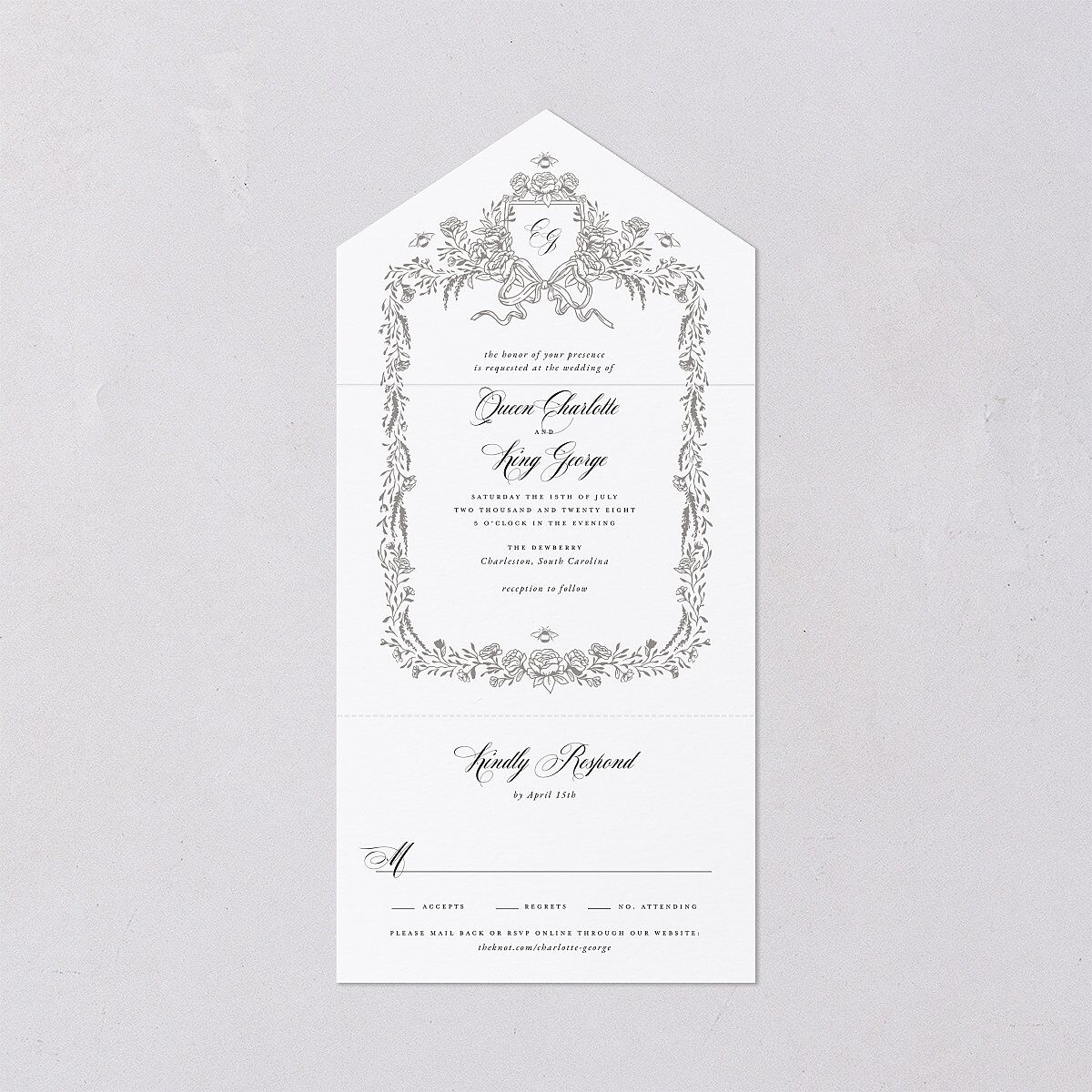 This all-in-one invitation displays your wedding plans inside a lush frame of illustrated roses and greenery. At the top is an elaborate crest holding you and your partner's initials in the center. Blooming roses, Bridgerton-inspired bumblebees, and a delicate bow surround the crests, adding a vintage, Regency-era aesthetic. Below, your full names, wedding details, and the words "Kindly Respond" appear in a blend of romantic cursive script and a sophisticated serif font. The elegant design continues on the back of the invitation with a tasteful image of a bow and a bee tying the whole look together.