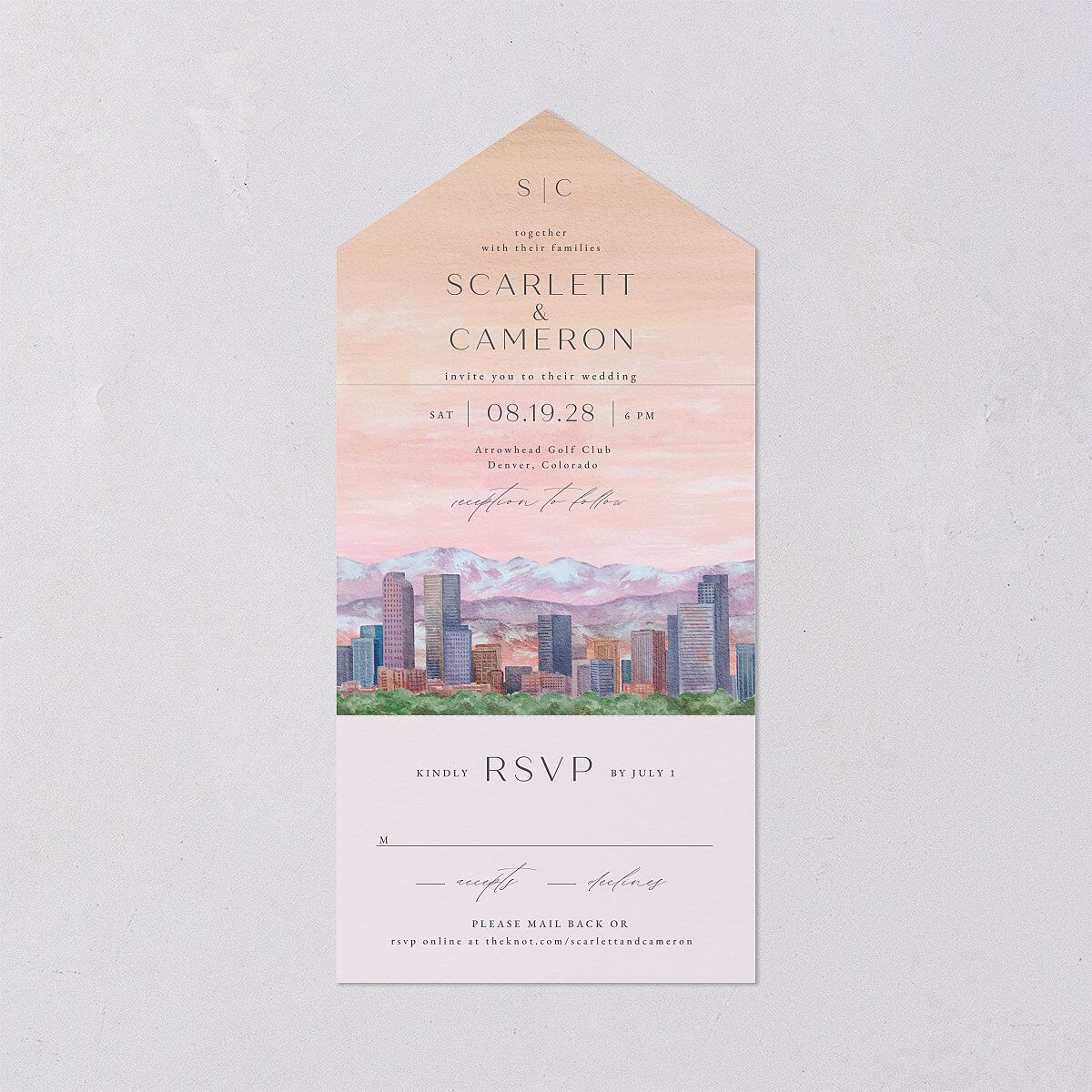 This charming all-in-one invitation features a watercolor cityscape of Denver with Colorado's breathtaking mountain peaks in the background. In the center, the details of your big day are outlined in a mixture of serif and sans serif typography.