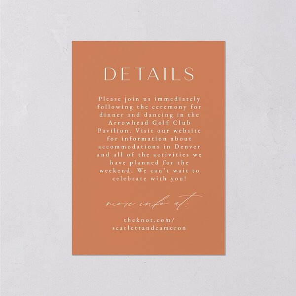 This enclosure card delivers the information your guests need in an elegant serif font against a solid color backdrop. On the reverse, you’ll find a watercolor-style cityscape of the iconic Denver skyline beneath your custom monogram.