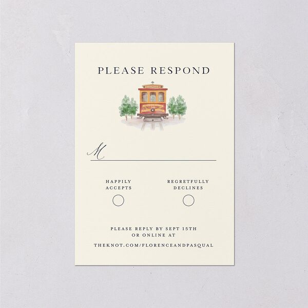 These wedding response cards embrace the vintage elegance of San Francisco's iconic cable cars. A centered layout and classic serif lettering complement the watercolor illustration. Your wedding date is displayed on the reverse side against your chosen accent color.