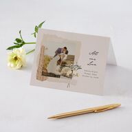 These wedding thank you cards pay tribute to the Pinterest collage trend with a torn-paper split backdrop and layered vintage paper textures that evoke a journal-like feel. A curated balance of negative space and pressed botanical elements creates an airy, refined composition. Aligned to the right, your message of love and gratitude is expressed in a thoughtful blend of handwritten script and typewriter-style serif typography.