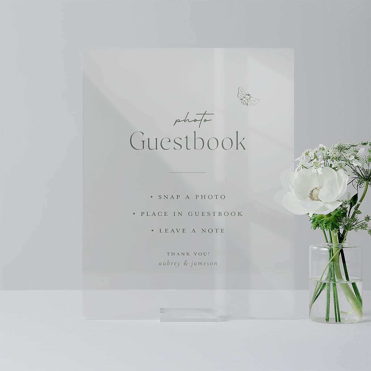 A buzzing bee motif flutters in the upper right corner of these menu tabletop signs. Set against a soft backdrop, your details come to life in a seamless mix of flowing handwritten-style fonts and classic serif lettering. The modern design is further elevated with your names at the bottom, rendered in charming lowercase typography that evokes an intimate feel.