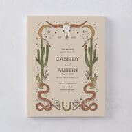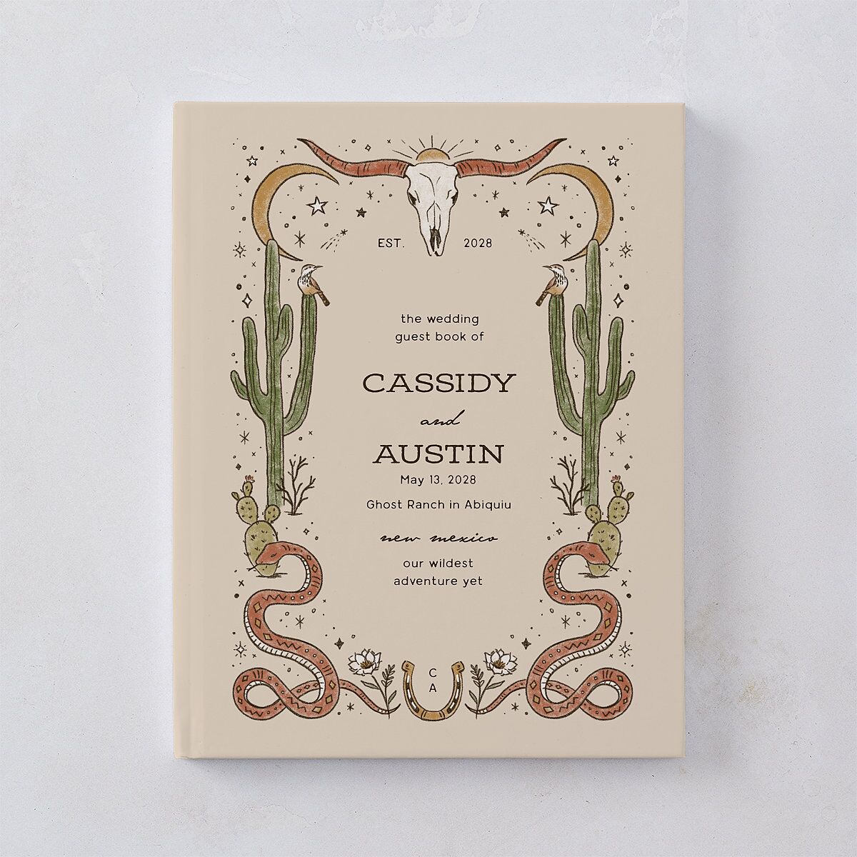 Create a tranquil oasis for your guests' loving words with this wedding guest book. The front displays your names, date, and venue details, framed by desert illustrations of cacti and crescent moons that create a Southwestern nouveau aesthetic.