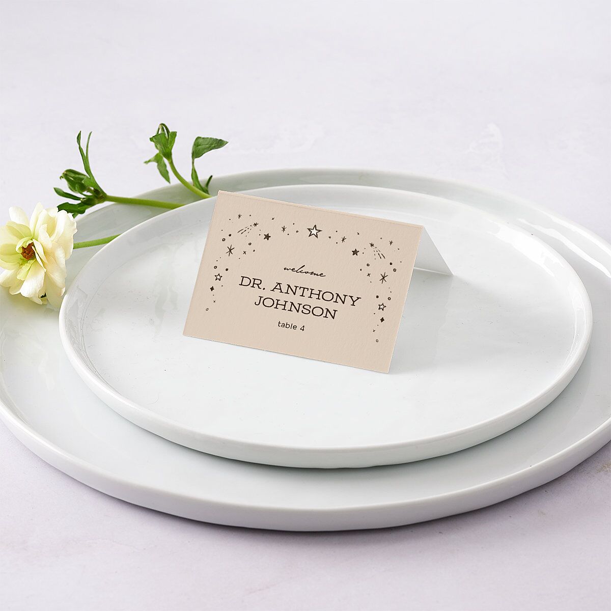 These place cards display each wedding guest's name and table assignment in a blend of vintage fonts against a muted backdrop. A collage of drawn desert stars arches over each name, fitting seamlessly with your Southwestern nouveau aesthetic.