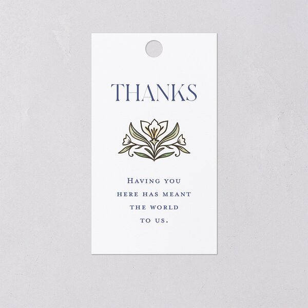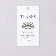 These favor gift tags show married initials on one side. The other side shows the word "Thanks" as well as a message and a sego lily illustration.