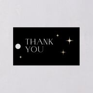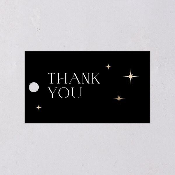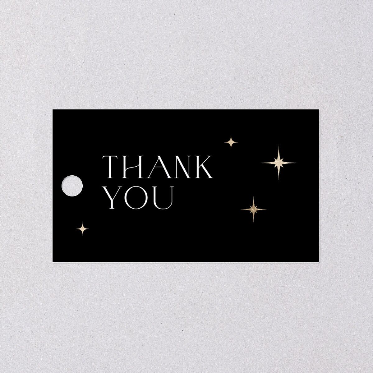 Our wedding favor tags are adorned with foil-glistening starry motifs, a perfect prelude to your starry night gifts for loved ones. "Thank You" appears in an all-caps serif font, aligned to the left. On the reverse, a heartfelt message of gratitude unfolds alongside your names, written in a graceful longhand script.