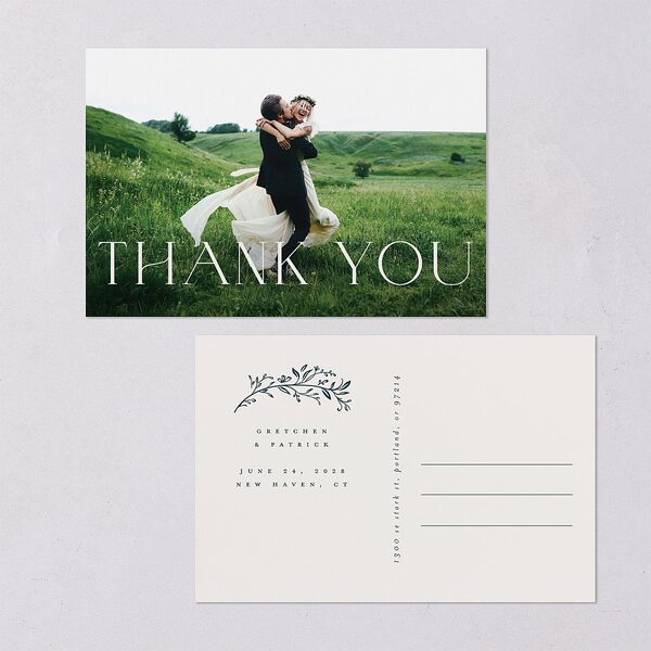 Your favorite wedding photo is overlaid with a thank-you message in large serif lettering on your personalized thank-you postcards. On the back, a floral design frames your names and thank-you message, which appear in formal serif font.