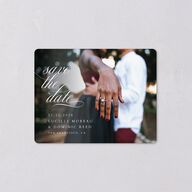 On this personalized save the date magnet, you and your beloved's favorite photo takes the spotlight. Guests are encouraged to mark the date of your union with a timeless script. Your wedding details are displayed just below.