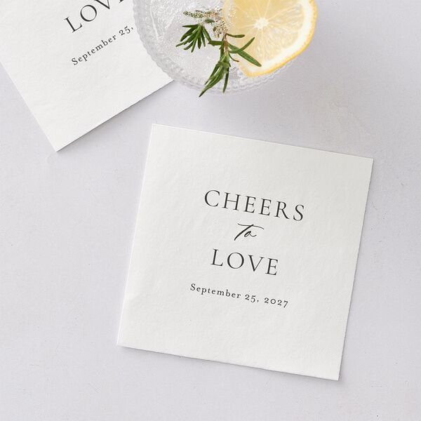 Two charming fonts express your sentiments on these elegant cocktail napkins. Below your personalized message, your wedding date appears as the perfect reminder of this special occasion.