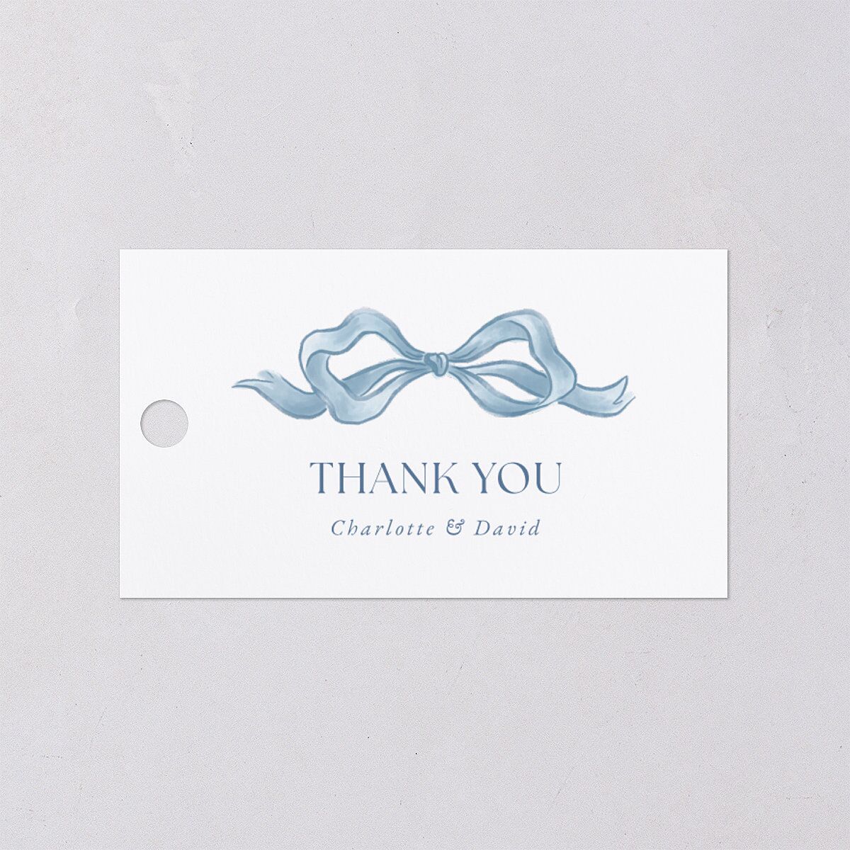 These favor gift tags feature a vintage tied bow design. The words "thank you" and your names appear below in a serif font, all on a solid background. The other side shows your monogram with an ampersand designed to mimic a flowing ribbon.