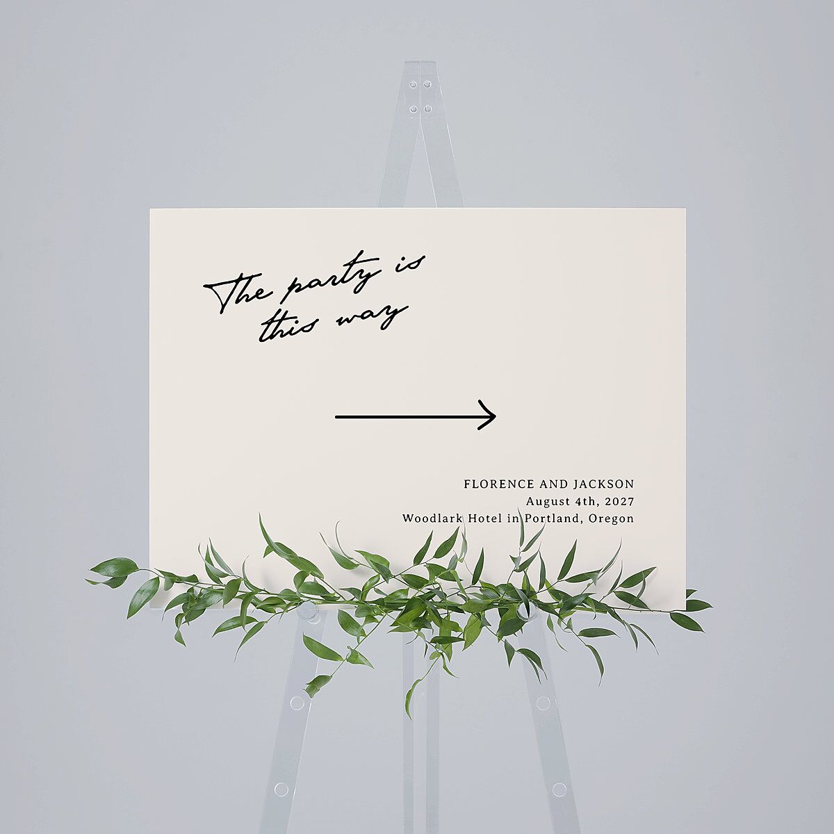 With a nod to retro Polaroids, these direction signs capture a charming slice of nostalgia paired with thoughtful design. On the left, a handwritten script mimics the familiar, casual style found at the bottom of vintage instant photographs, adding personality and warmth. To the right, a sleek arrow graphic ensures guests find their way while your wedding details, including names, date, and venue location, appear in charming serif type.