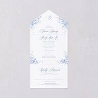 Capture the essence of regal romance with these all-in-one wedding invitations. Elegant cursive font displays the details at the heart of the invitation, which is complemented by delicate vintage florals and crowned with a dignified monogram.