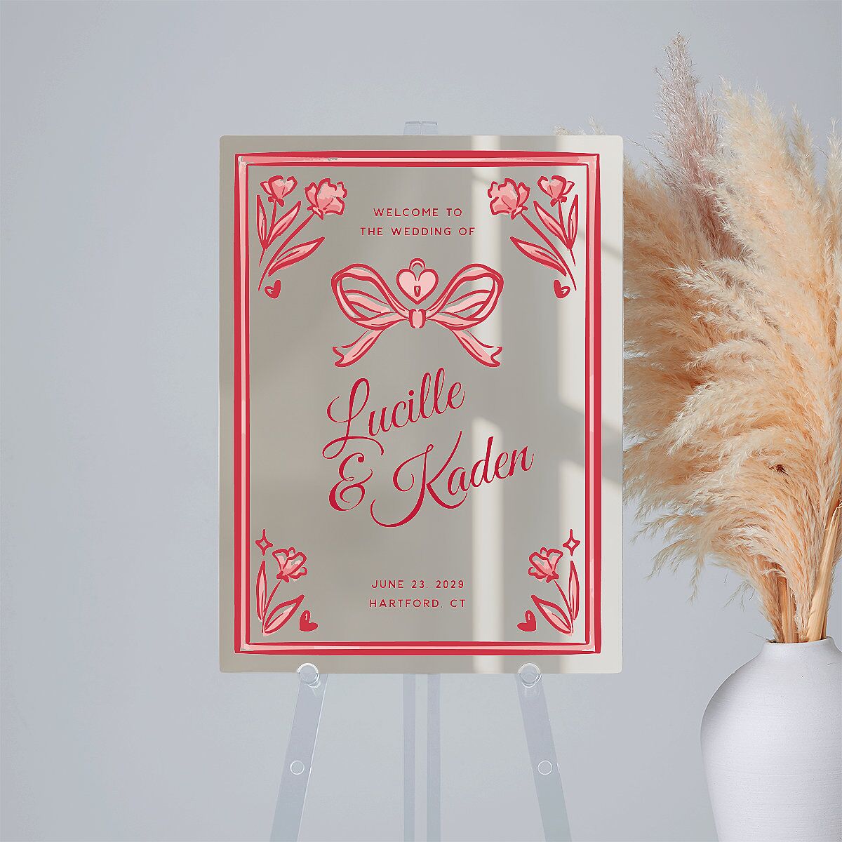 A painterly ribbon and heart locket illustration crowns the top of these welcome signs, surrounded by graceful blooms and a soft double-line border. Your names take center stage in curving calligraphy, contrasting tastefully with clean sans-serif details listed below.
