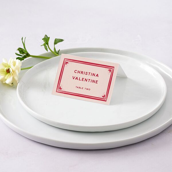 Each guest’s name is framed by a graceful double-line border with petite heart accents. Inside, structured sans-serif type keeps the layout clean and modern, while the softly striped reverse featuring your initials adds a nod to vintage charm.