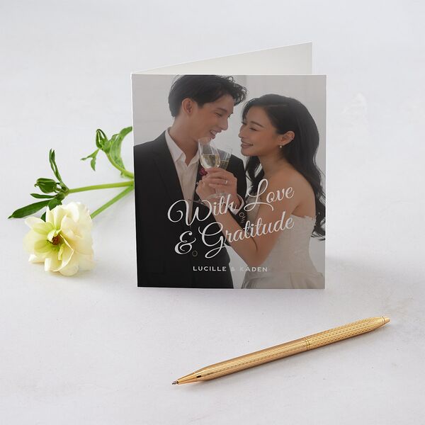 Decorated with a painterly heart-shaped locket and flowing ribbon illustrations, these thank-you cards express a sentiment of gratitude overlay of a chosen photo and framed within a graceful double-line border. Presented within, curling calligraphy introduces your heartfelt message, and finished with structured sans-serif type below. The reverse side reveals your initials in a monogram style, set against softly striped detailing for a bit of vintage playfulness.