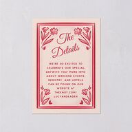 Perfectly symmetrical florals and petite hearts frame your event’s details within a graceful double-line border on these wedding enclosure cards. Elegant calligraphy and simple sans-serif type balance artistry with clarity, while the reverse displays your initials as a monogram against a boldly colorful backdrop.