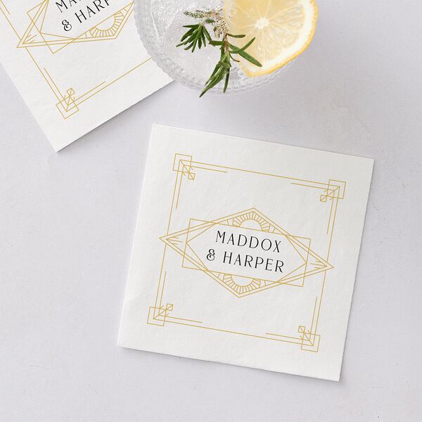 These cocktail napkins feature bold Art Deco lines, bringing a sense of symmetry to your celebration. The clean shapes and geometric patterns create a streamlined look. At the heart of the design, your names are prominently displayed in a grand central composition, printed in ornate serif lettering that adds a striking flair to the overall design.