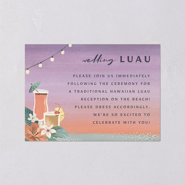 These wedding enclosure cards feature a tropical-island theme, with a vintage painting filled with palm trees, sunset skies, exotic cocktails, and string lights. The additional details of your wedding day are showcased in simple and cursive script. These colorful enclosure cards will tie in perfectly with your destination wedding and beachside celebration.