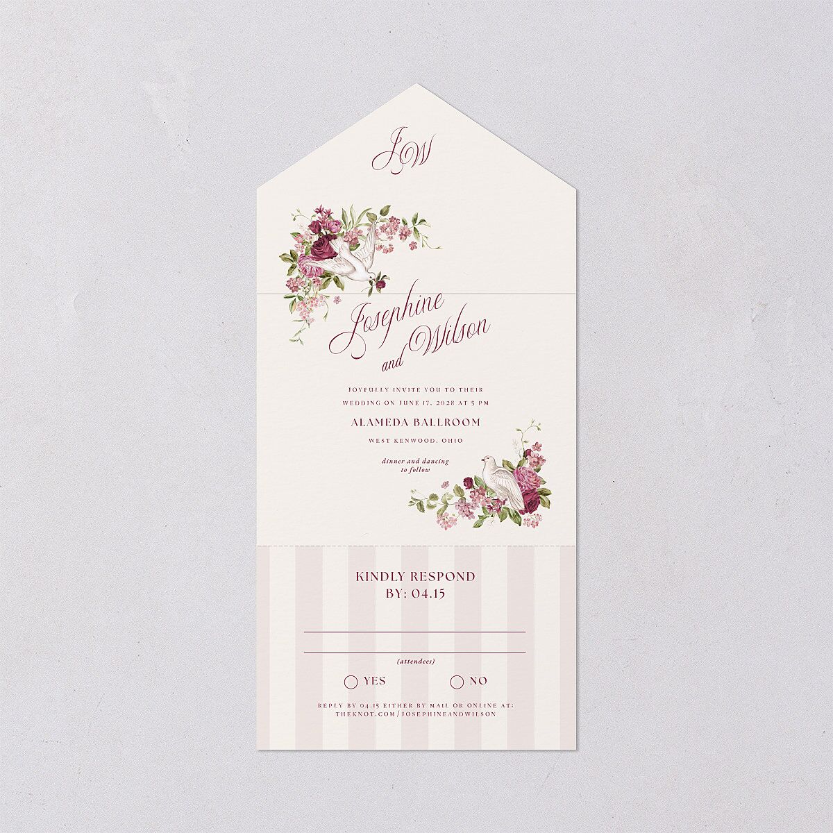 These all in one wedding invitations include a main invitation and a detachable response card at the bottom, all designed to fold seamlessly into a self-contained envelope format. Flourished with romantic doves, roses, greenery, and Victorian-inspired typography, this suite sets the tone for a truly vintage celebration yet to come.