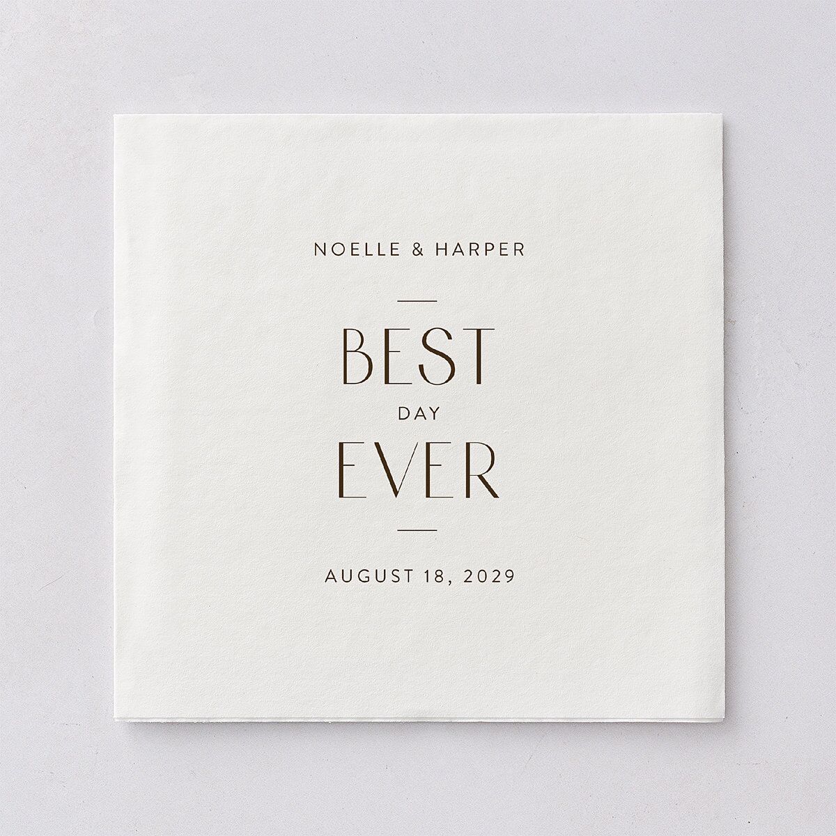 Simple, understated, and utterly stylish, these vintage luncheon napkins make a significant statement without complication. Your names, a sweet personalized statement, and your wedding date are spaciously arranged and presented in two charming sans serif fonts.