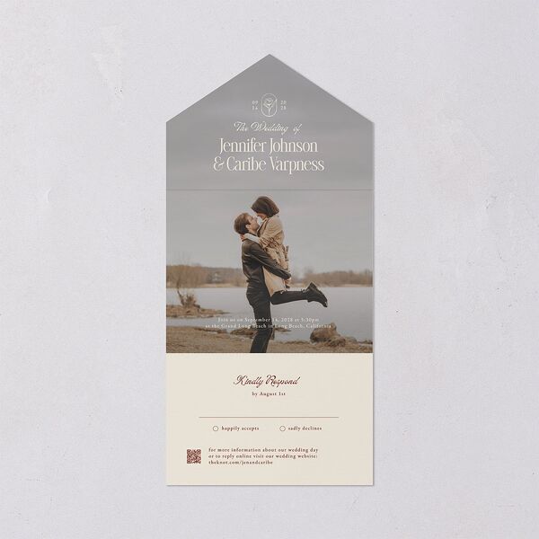 Vintage hues and nature-inspired details become one in these all-in-one wedding invitations. Each invitation unfolds to reveal a full-bleed photograph of you both soaking up the great outdoors, overlaid with refined typography. Below, a designated space invites guests to share their RSVP details, printed against a muted backdrop and accompanied by a QR code linking to your wedding website.