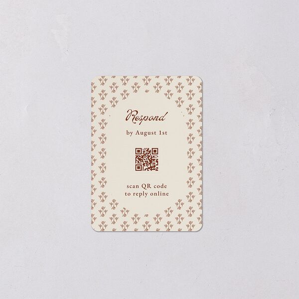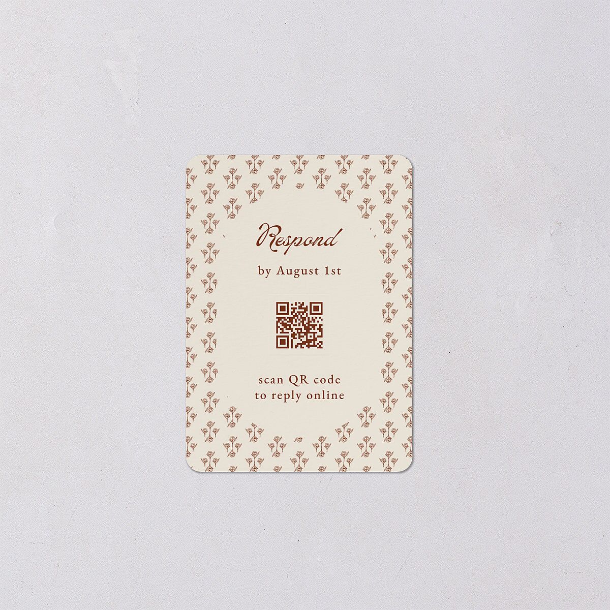 Romance blossoms in every floral sprig layered within this wallpaper-inspired composition. Each mini rsvp card carries an antiquated editorial charm, framed by an old-world color palette and floral motifs. At the center, a softly cleared oval showcases your response request in longhand typography, paired with a QR code that connects guests to your wedding website. On the reverse, a full-bleed photograph of you and your partner is complemented by a date-stamped floral emblem.