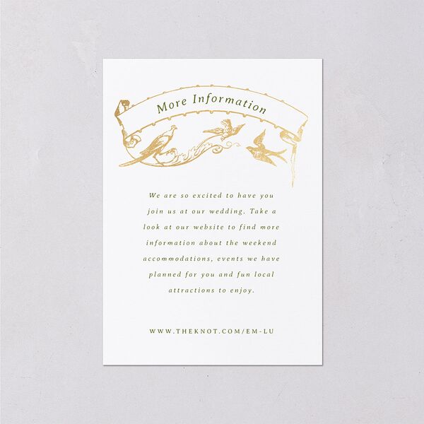 A shimmering banner adorns the top of your wedding enclosure cards, on which is written "More Information." Birds drawn in a vintage and ornate toile style flitter around the banner. The details of your celebration and wedding website are printed below.