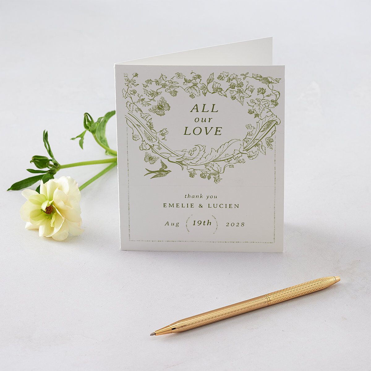 Send a message of thanks with these vintage-style thank you cards, which continue your wedding's theme of pastoral yet elegant Toile de Juoy. The cards are folded and leave room for you to customize a message on the inside.