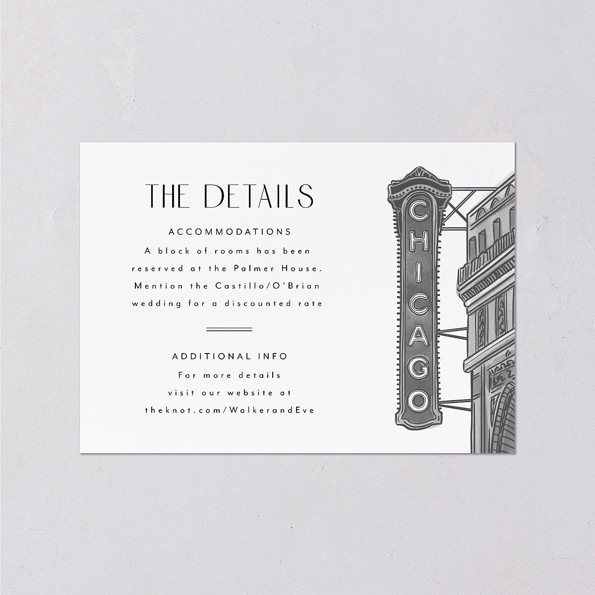 These wedding enclosure cards feature a watercolor rendering of the iconic Chicago Theatre marquee. Art Deco fonts display important event information, complementing the Windy City-inspired design.