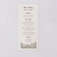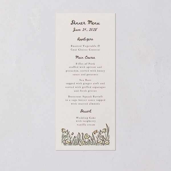 Soft florals and hand-sketched greenery bring the tranguility of the forest to these wedding menus. Each course title is presented in handwritten script, while serif text lists each dish below, inviting your loved ones to savor every detail.
