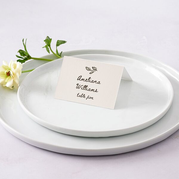 A delicate leafy motif drifts gracefully above each guest's name, elegantly displayed in a handwritten style, with the corresponding table number neatly positioned just below.