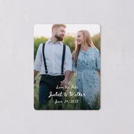 Whether you exchange your vows in a sunlit meadow or the comforts of a native woodland, these save the date magnets capture that outdoorsy spirit. Each magnet features a background lovingly filled with an image of you and your partner, overlaid in cursive with the anticipated date of your wedding.