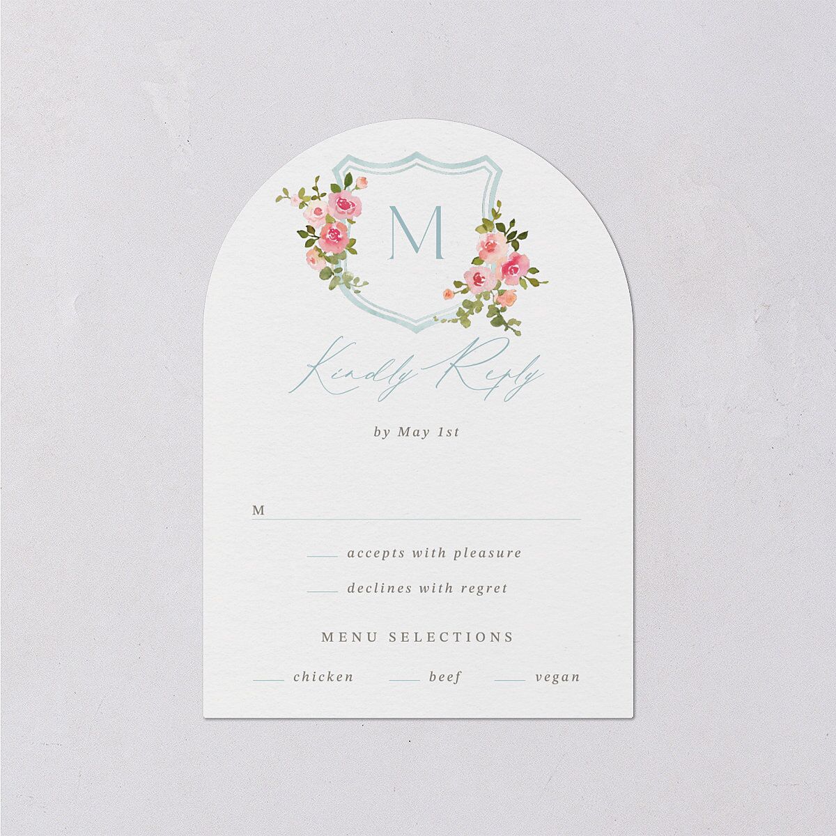 These artistic response cards kindly beckon your loved ones to reply to your rsvp request in a cursive typeface. Above the request, a dainty watercolor crest surrounded by rosy blooms embraces your chosen personal inital. Guests can simply sign the card with their preferred entrée selections, or if they prefer to reserve online, they can scan the QR code on the reverse that leads to your wedding website.
