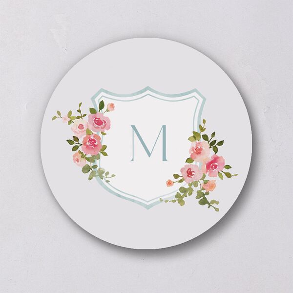 Radiant and rosy, much like your upcoming celebration, these floral-adorned wedding stickers make a beautifully artistic statement. Within a soft pastel crest, your shared initial stands proudly, surrounded by watercolor blooms and foliage that lovingly intertwine to form a delicate botanical frame.