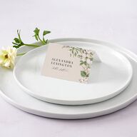 These botanical place cards feature a neutral backdrop accented by a wildflower arrangement. To the left of the floral design, your guests' names are displayed in uppercase serif type, with their table number below in longhand script.