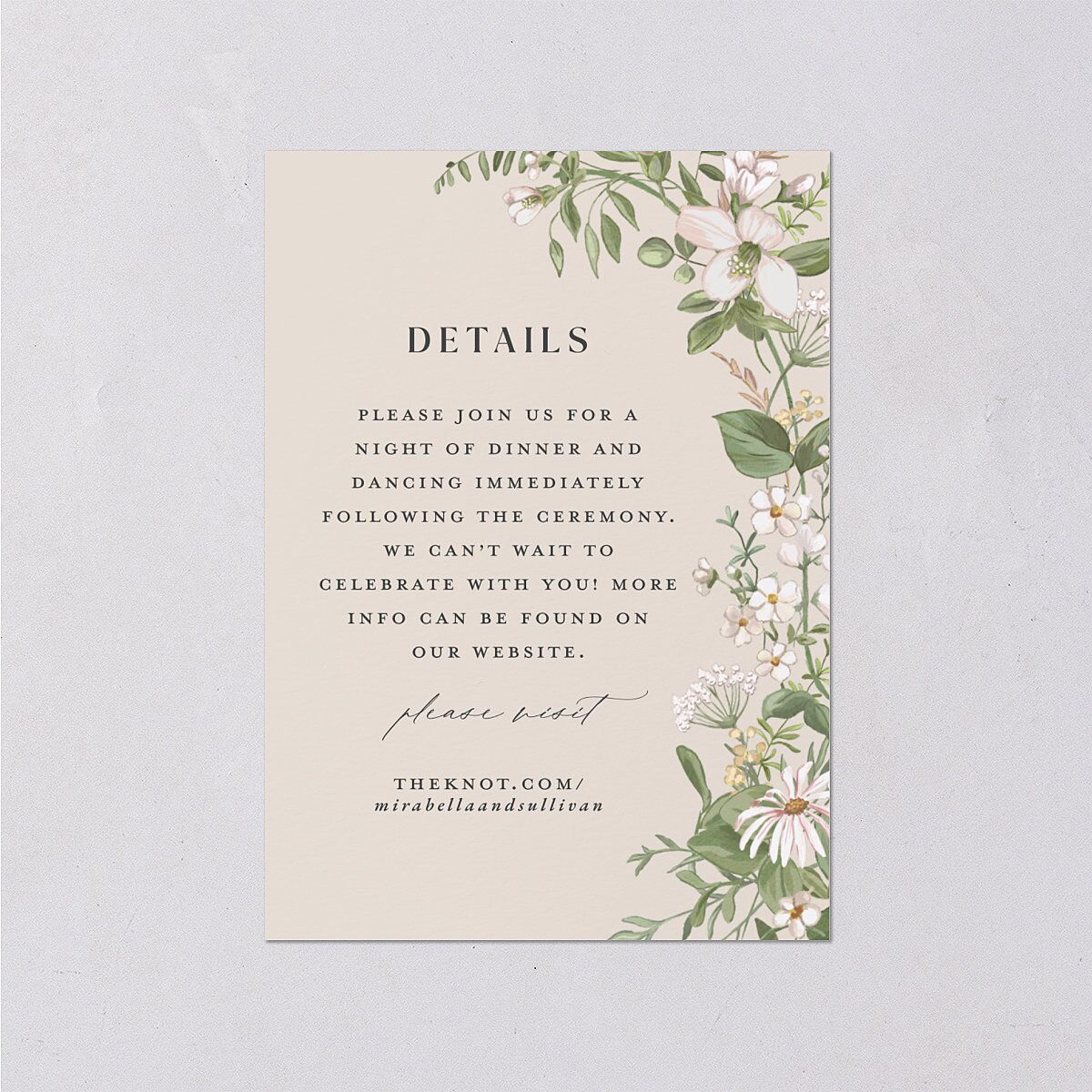 Serif and cursive lettering pair beautifully with a hand-painted illustration of wildflowers along the right side of these wedding enclosure cards. You’ll find all the essential details of your big day, along with a link to your wedding website for additional information. On the reverse, a delicate swirl of wildflowers frames your personal monogram.