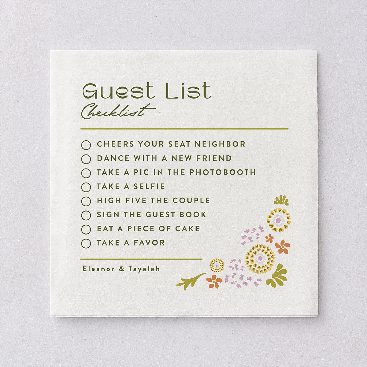 These delightful luncheon napkins add a sense of fun with a playful guest list checklist. The lighthearted checklist will keep your guests entertained while toasting your nuptials, making sure they get to experience all the enjoyment of your wedding.