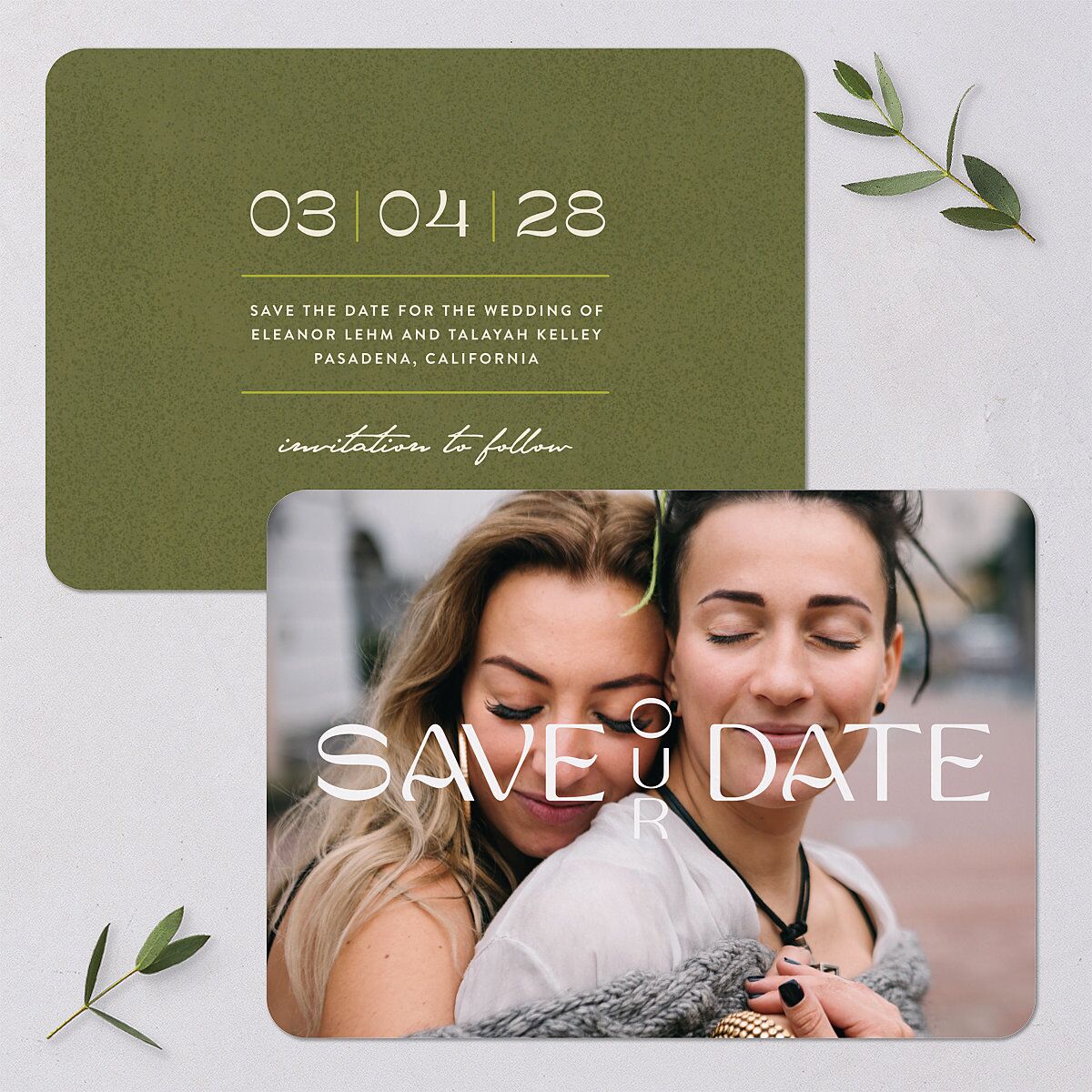A bold uppercase vintage typeface decorates the front of these save the date cards. They also feature a romantic engagement photo, with the important wedding date displayed in large digits on the reverse side.