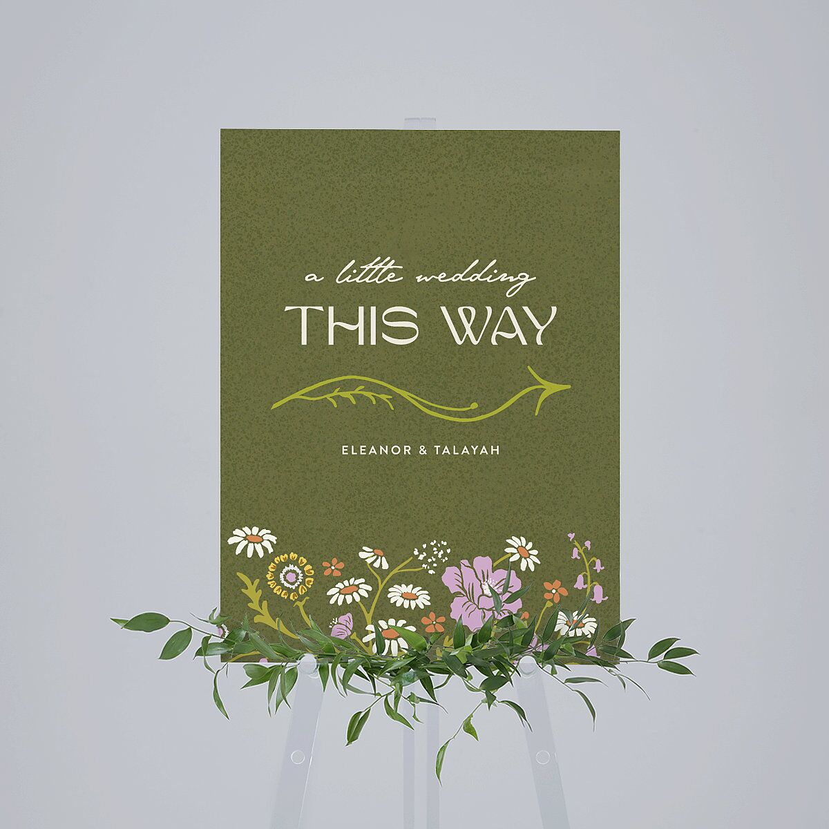 Guide your guests to your bohemian celebration with these Art Nouveau-inspired direction signs. A graceful vine forms the shape of an arrow beneath flowing, organic-style cursive lettering, pointing the way to your ceremony, cocktail hour, and reception. At the bottom, floral artwork blooms against a lush backdrop, leaving a fresh-as-a-daisy impression.
