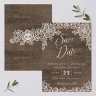 This gorgeous save the date features floral lace artwork on opposite corners, delicately overlaying your favorite engagement photo. Rustic fonts and calligraphy announce your wedding date over a rich woodgrain background. The back features your lace monogram and a spot for your wedding website URL.