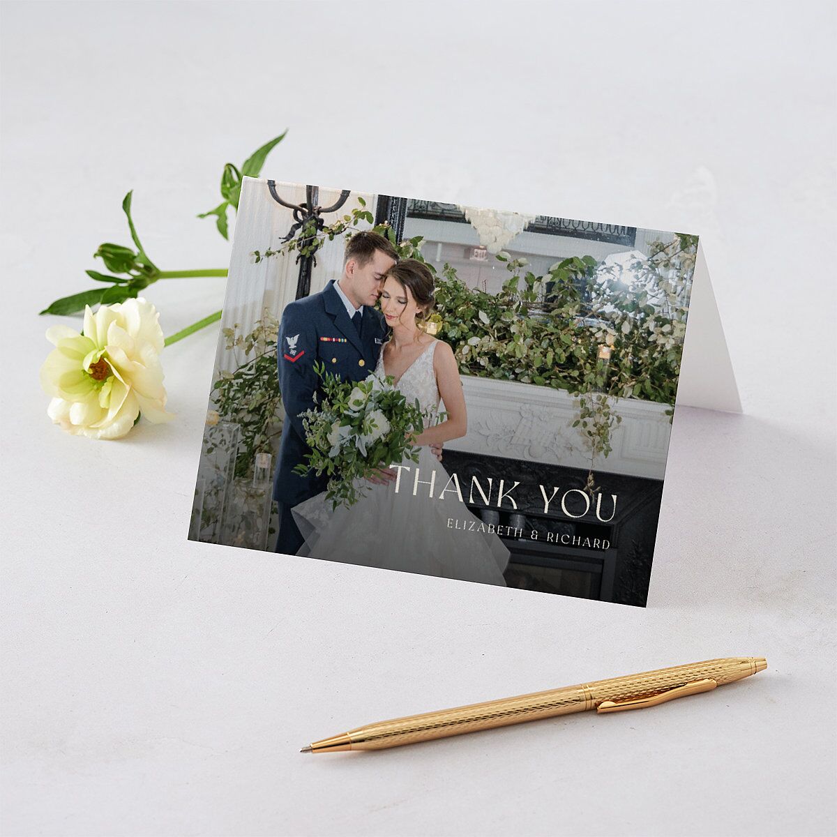 Each of your thank you cards has your chosen photo as a beautiful backdrop. On this backdrop are the words "Thank you" and your first names.